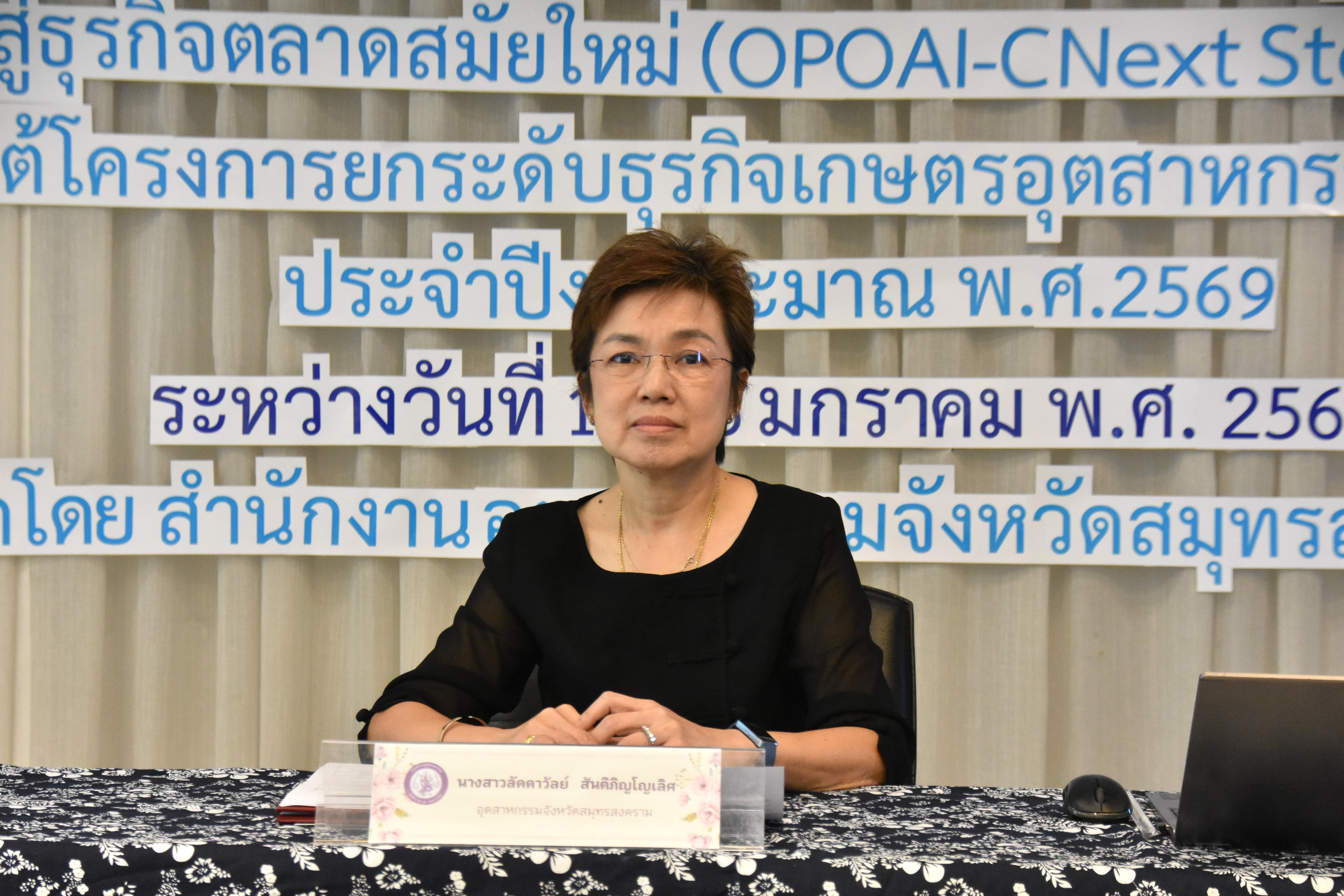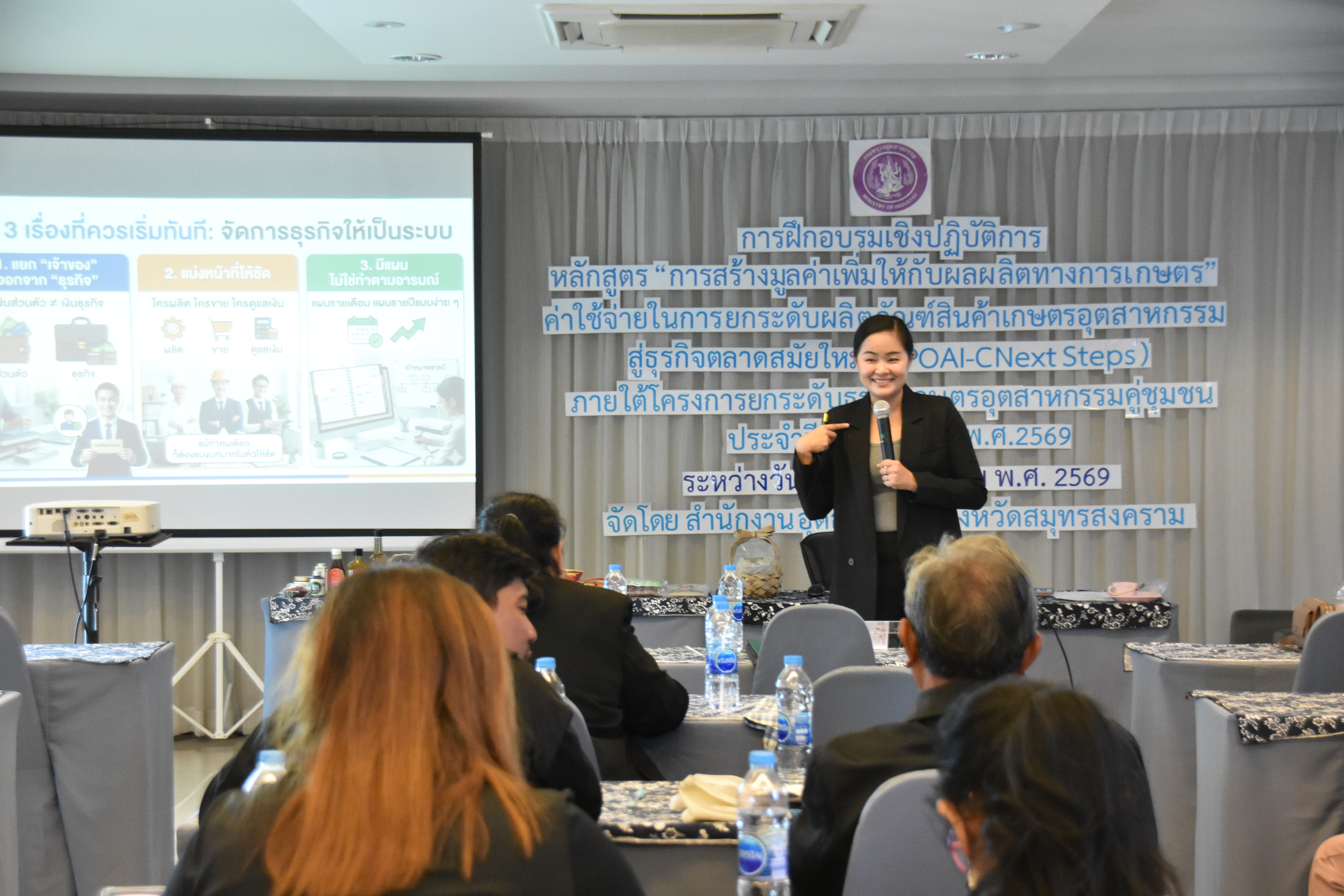 นางสาวลัดดาวัลย์ สันติภิญโญเลิศ อุตสาหกรรมจังหวัดสมุทรสงคราม เป็นประธานในพิธีเปิด การฝึกอบรมเชิงปฏิบัติการ หลักสูตร “การสร้างมูลค่าเพิ่มให้กับผลผลิตทางการเกษตร” โครงการค่าใช้จ่ายในการยกระดับผลิตภัณฑ์สินค้าเกษตรอุตสาหกรรมสู่ธุรกิจสมัยใหม่ (OPOAI-C Next Steps) ประจำปีงบประมาณ พ.ศ. 2569 โดยมี นางเกสรา ไชยรส หัวหน้ากลุ่มส่งเสริมและพัฒนาอุตสาหกรรม กล่าวรายงาน ซึ่งการฝึกอบรมจัดขึ้นในระหว่างวันที่ 15 - 16 มกราคม 2569 จำนวน 26 ราย ซึ่งการฝึกอบรมเชิงปฏิบัติการในครั้งนี้ มีวัตถุประสงค์ เพื่อถ่ายทอดองค์ความรู้ด้านการเพิ่มมูลค่าผลผลิตทางการเกษตรด้วยนวัตกรรม เทคโนโลยี และการพัฒนาผลิตภัณฑ์ การเสริมสร้างความรู้ ความเข้าใจในการจัดทำแผนธุรกิจที่มีความเป็นไปได้ในเชิงพาณิชย์ และสามารถสร้างโอกาสในการลงทุนเพื่อยกระดับผู้ประกอบการเกษตรอุตสาหกรรมและวิสาหกิจชุมชนให้สามารถแข่งขันในตลาดสมัยใหม่อย่างยั่งยืน รวมทั้งสร้างเครือข่ายความร่วมมือระหว่างภาครัฐ ภาคเอกชน และชุมชนในการพัฒนาเศรษฐกิจฐานราก โดยมีการบรรยายในหัวข้อ ปลุกพลังเสริมแนวคิดการเป็นผู้ประกอบการ Entrepreneurial Mindset การสร้างมูลค่าเพิ่มให้กับผลิตผลทางเกษตรด้วยเทคโนโลยีและนวัตกรรม จุดประกายไอเดียธุรกิจสร้างสรรค์ Workshop การออกแบบพัฒนาผลิตภัณฑ์ให้ตรงกับความต้องการของตลาดและการจัดทำร่างต้นแบบผลิตภัณฑ์ Draft Prototype และกิจกรรม Workshop การวางแผนธุรกิจและการจัดทำแผนธุรกิจ Business Model ในการบรรยายวันที่สอง จะบรรยายในหัวข้อ การบริหารจัดการองค์กรและสร้างวินัยทางการเงินสู่การสร้างธุรกิจ สูตรลับจับคู่สื่อ เลือกใช้เครื่องมือออนไลน์และออฟไลน์ให้เหมาะกับธุรกิจ และการนำเสนอแนวคิดการจัดทำร่างต้นแบบผลิตภัณฑ์ Draft Prototype พร้อมแผนธุรกิจ Business Model โดยให้ผู้ประกอบการได้นำเสนอ 5 - 10 นาที ทั้งนี้ได้รับการสนับสนุนจาก พัฒนาการชุมชนจังหวัดสมุทรสงคราม พาณิชย์จังหวัดสมุทรสงคราม และเกษตรจังหวัดสมุทรสงคราม ร่วมพิจารณาให้ข้อเสนอแนะสำหรับแนวคิดร่างต้นแบบผลิตภัณฑ์ Draft Prototype พร้อมแผนธุรกิจ ของกลุ่มเป้าหมาย ณ โรงแรมโคโค่วิว ตำบลแม่กลอง อำเภอเมืองสมุทรสงคราม จังหวัดสมุทรสงคราม