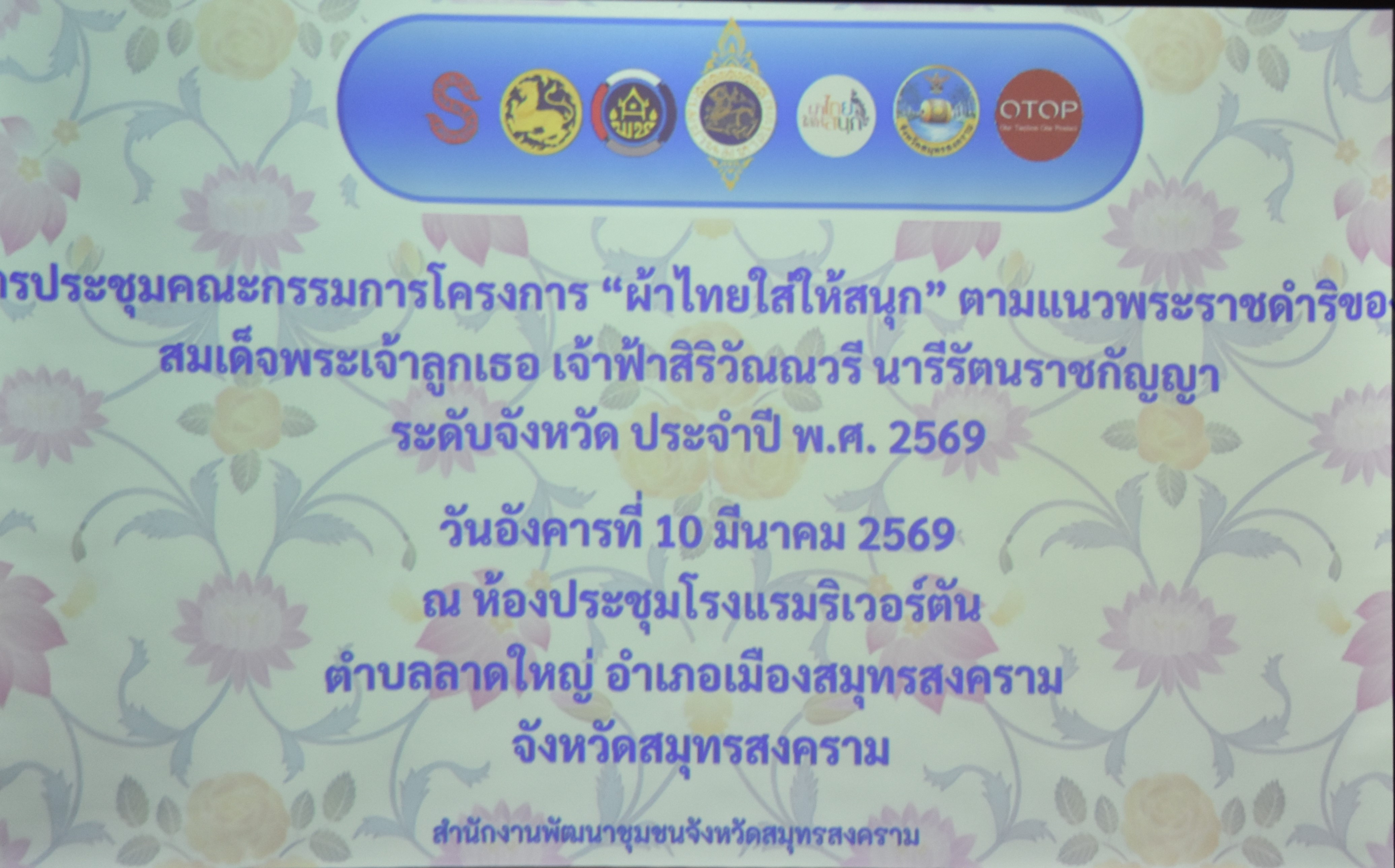 นางสาวลัดดาวัลย์ สันติภิญโญเลิศ อุตสาหกรรมจังหวัดสมุทรสงคราม เข้าร่วมประชุมคณะกรรมการโครงการ “ผ้าไทยใส่ให้สนุก” ตามแนวพระราชดำริของสมเด็จพระเจ้าลูกเธอ เจ้าฟ้าสิริวัณณวรี นารีรัตนราชกัญญา ระดับจังหวัด โดยมี นายชยชัย แสงอินทร์ ผู้ว่าราชการจังหวัดสมุทรสงคราม เป็นประธานในการประชุม พร้อมด้วย หัวหน้าส่วนราชการ ข้าราชการ และเจ้าหน้าที่เข้าร่วมการประชุมดังกล่าว ณ ห้องประชุม glasshaus โรงแรมริเวอร์ตัน ตำบลลาดใหญ่ อำเภอเมืองสมุทรสงคราม จังหวัดสมุทรสงคราม